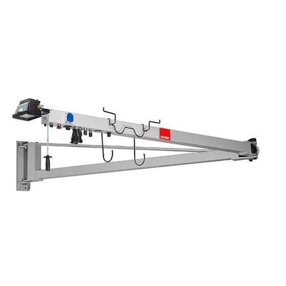Bras oscillant avec terminal de service intégré, pour l’aspiration de micro-poussières générées au cours d’un processus de ponçage ou par divers usinages industriels et pour le raccordement d’outils pneumatiques et électriques;