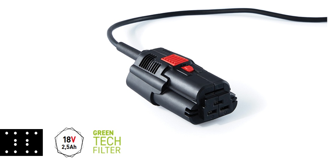 • Les éléments de batterie au lithium-ion (18V 2,5Ah) avec indicateurs DEL indiquent le niveau de charge avec la pression d’un bouton. Une charge complète permet entre 35 et 45 minutes de temps de fonctionnement continu.