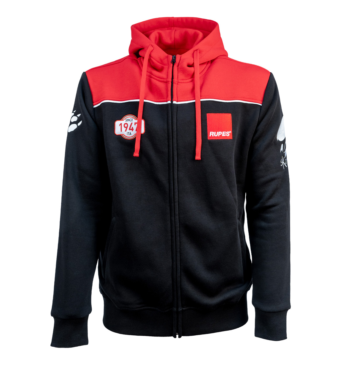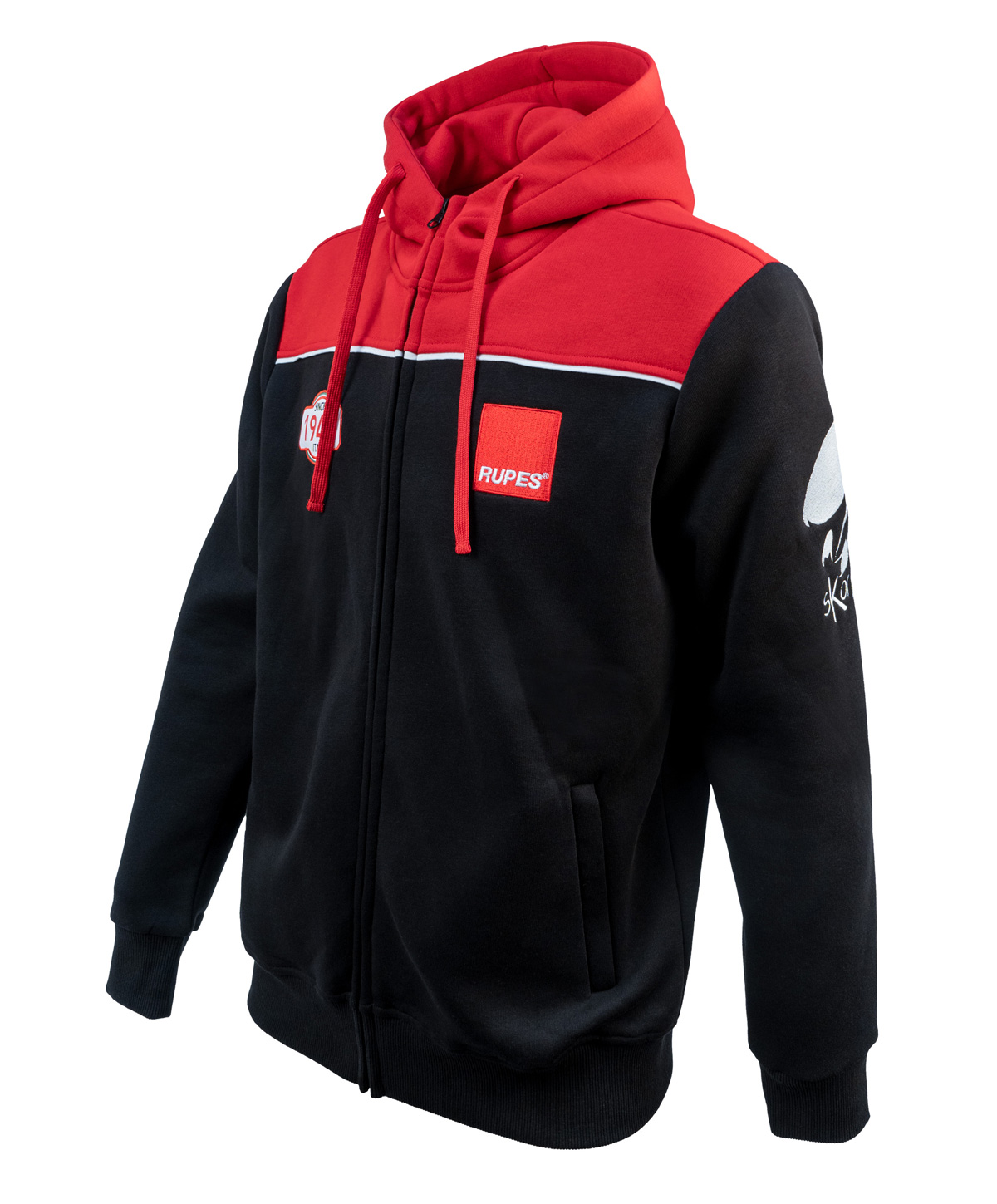 Composé à 80 % de coton brossé et à 20 % de polyester, ce sweat à capuche noir et rouge présente des détails brodés sur la poitrine, notamment le logo RUPES et l’année de création de RUPES (1947), ainsi que les logos BigFoot et Skorpio sur les deux manches.